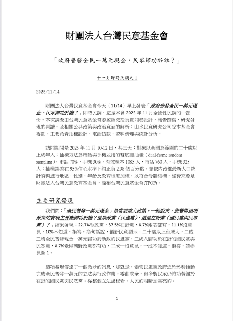 政府普發全民一萬元現金,民眾歸功於誰?(2025年11月14日)